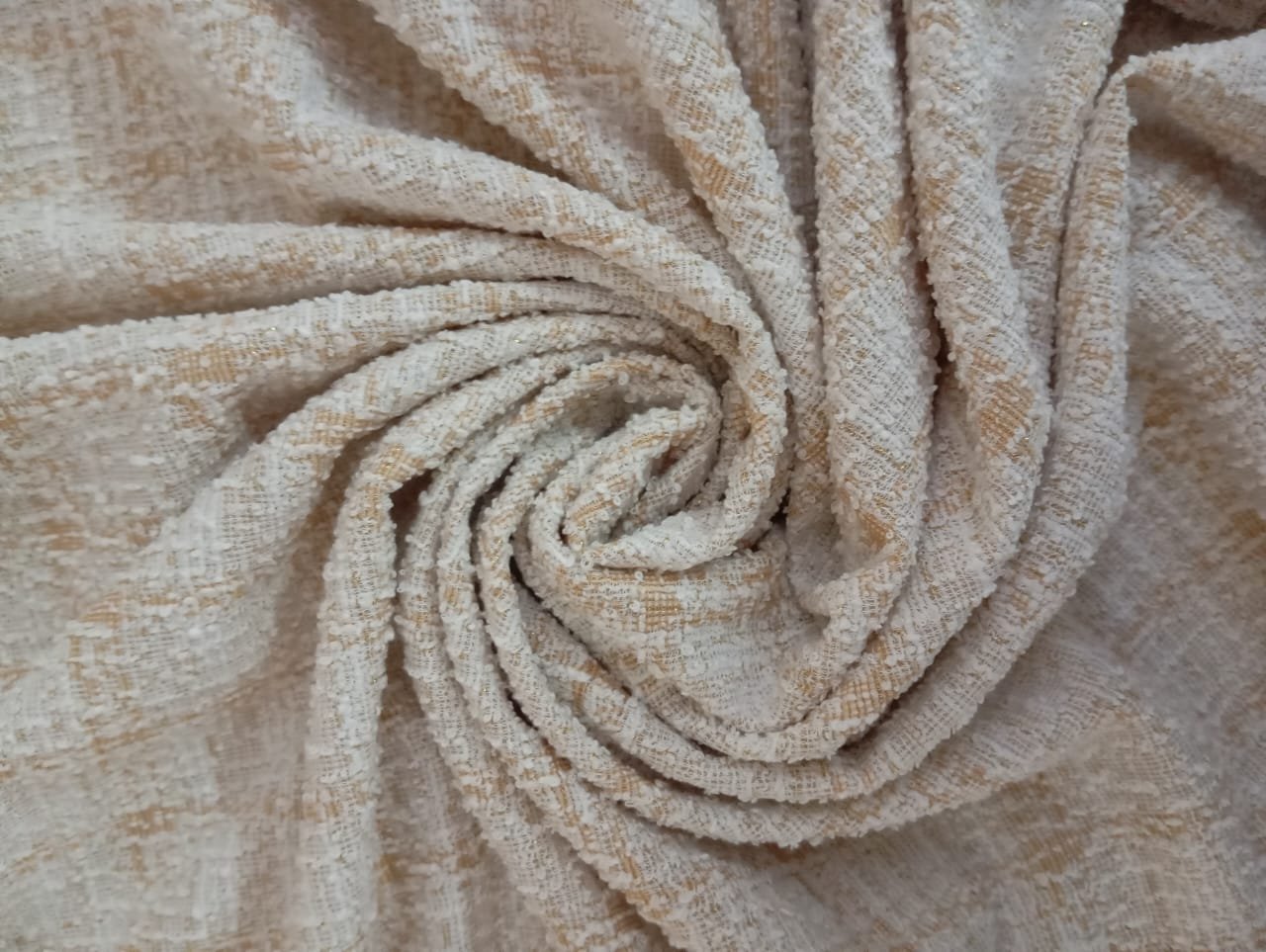 Textura/Estampa: Tweed, com brilho sutil e discreto